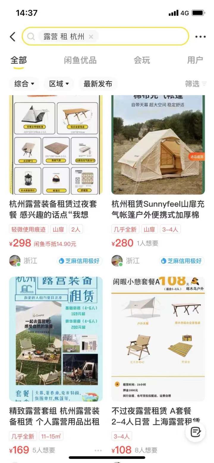 小闫在闲鱼上线租赁各种露营装备,近期已有700多次浏览。小闫在页面写到,支持指定地点自提,也可以安排杭城同城配送。譬如,适合2-4人的不过夜露营套餐,比工作日贵了20元,节假日租借价在159元/24个小时。其中,包含了天幕、蛋卷桌、克米特椅、营地车、野炊锅、收纳箱、保温箱、烧烤架、烤盘等。而另一款适合过夜的露营套餐,多了棉布帐篷、自充气垫、睡袋和气枕,价格为339元/24小时。