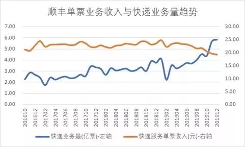 上述特惠件的推出,降低了顺丰的平均单票收入:2019年12月,顺丰单票收入19.30元,同比下滑18.9%,环比下滑2.0%,在整个三季度,顺丰的单票收入同比下降 7.4%。
